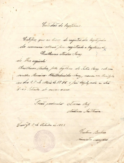 Saibam que o nome de batismo do patriarca era GUILHERME ANDRES JANZ conforme certidão, datada de 08/10/1923, da Comuna Luterana Alemã, batizado em 08 de setembro de 1896, em Curitiba, mas foi registrado no CARTÓRIO, com o nome de GUILHERME JANZ.